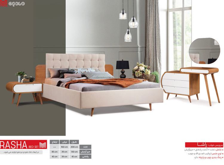 شامل : تخت ، میزآرایش ، 2 عدد پاتختی