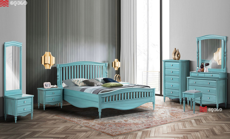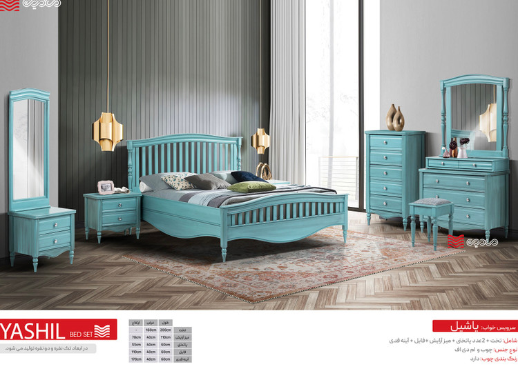 شامل : تخت ، میزآرایش ، 2 عدد پاتختی ، فایل ، آیینه قدی و دوکشو