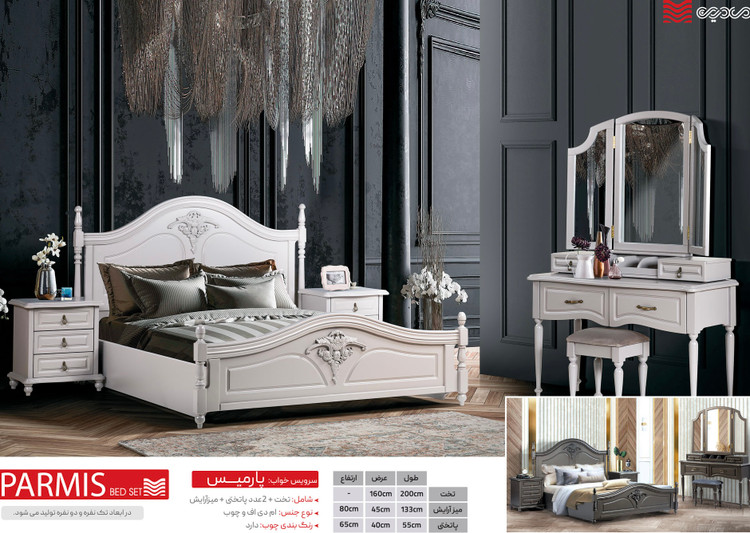 شامل : تخت ، میزآرایش ، 2 عدد پاتختی